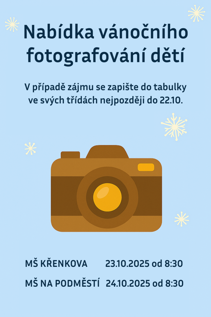 Vážení rodiče, nabízíme Vám vánoční fotografie vašich dětí. V případě zájmu se zapište do tabulky ve svých třídách nejpozději 22.10. Čas focení dětí: MŠ Křenkova 23.10.2025 od 8:30 MŠ Na Podměstí 24.10.2025 od 8:30